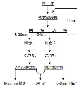 首先,大塊重晶石礦需經(jīng)過破碎,將大塊礦破碎至小塊,使重晶石與廢石單體解離,由于重晶石性脆易碎,因此該破碎過程一般選用鄂式破碎機(jī)。其次破碎后的重晶石礦中粗細(xì)不均勻,為了使破碎產(chǎn)品粒度達(dá)到重選最佳入選粒度,常常需要經(jīng)過篩分,將礦石篩分為0-8mm和8-30mm兩種粒級(jí),并別進(jìn)入料倉和給料系統(tǒng)。電磁振動(dòng)給料機(jī)保證了物料給入的均勻有序,使跳汰機(jī)選礦效果達(dá)到最佳,兩種粒級(jí)物料分別給入梯形跳汰機(jī)和AM30跳汰機(jī),最終獲得粗粒精礦,細(xì)粒精礦和尾礦,經(jīng)過脫水分別輸送至各自物料場(chǎng)地。